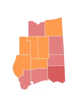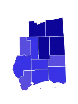 The 2nd district encompasses the Mississippi Delta, taking in most of Jackson, the riverfront cities of Greenville, Natchez and Vicksburg, and the interior market cities of Clarksdale, Greenwood and Clinton. The district was expanded during the 2020 census redistricting. The incumbent was Democrat Bennie Thompson, who was re-elected with 66.0% of the vote in 2020.[7] Thompson cruised to re-election in 2022 as expected, though Brian Flowers did give him his toughest race since 2004, when Clinton LeSueur achieved 41% of the vote.[24]