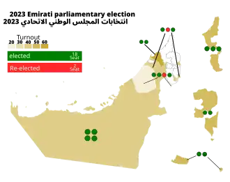 Parliamentary elections were held in the United Arab Emirates on 7 October 2023 to elect 20 of the 40 members of the Federal National Council.[1][2][3] As political parties are banned in the UAE, all candidates run as independents.[4] The election was the first to be conducted completely electronically, 92.69% of voters chose to vote remotely in the election cycle.[2][3]