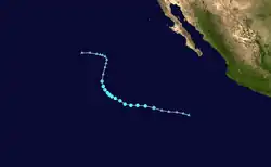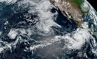 Forecasts at the outset of the 2023 season predicted busier-than-normal tropical cyclone activity in the eastern Pacific basin, largely due to El Niño.[6] However, no tropical cyclones developed until June 27, when Hurricane Adrian initially formed, becoming the latest first-named Eastern Pacific tropical storm since Tropical Storm Agatha in 2016.[7] In July, Hurricane Calvin became the season's first major hurricane, later passing just south of the Big Island of Hawaii as a tropical storm, bringing widespread rainfall to the area and neighboring Maui. In August, Category 4 Hurricane Dora passed south of the Hawaiian Islands and contributed to strong gradient winds over Hawaii, which in turn helped fan the flames of multiple devastating wildfires.[3] Later that month, Hurricane Hilary made landfall as a tropical storm in Baja California, later bringing torrential rainfall and gusty winds to the Southwestern United States. In early September, Hurricane Jova, the first Category 5 hurricane in the basin since 2018, caused rainfall, high waves and rip currents in areas previously affected by Hilary.