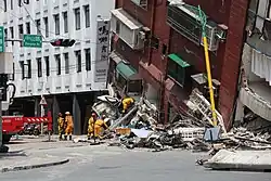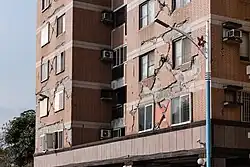 The Central Emergency Operation Center reported at least 2,498 cases of damage nationwide following the earthquake, with 1,140 instances in Taipei, 497 in New Taipei and 366 in Hualien County.[69] At least 111 structures were destroyed, while 1,939 houses, 870 buildings and 75 roads and tunnels were damaged by the earthquake.[70][71] Of the 28 reported building collapses, 17 of them occurred in Hualien, while the other 11 occurred in Yilan, New Taipei and Keelung.[55] Collapses trapped at least 20 people in the immediate aftermath.[72] Twelve buildings deemed unsafe were ordered demolished by authorities.[73] In Hualien City, two houses, the nine-story Uranus building and a restaurant collapsed, trapping many people inside.[74][75] One person was found dead[52] while 22 others were later rescued from the Uranus building,[30] which was built in 1986 prior to the introduction of more stringent building codes in the wake of the 1999 Jiji earthquake and was found to be lacking supporting ground-floor front pillars.[76] Forty-eight residential buildings in the city were damaged,[61] and the National Hualien Girls' Senior High School also sustained heavy damage.[77][78] At least 200 residents living near the epicenter were displaced.[61] A total of 1,400 households in Hualien County were damaged.[71]