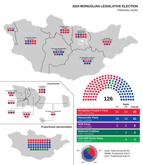 30. ^ Adiya, Amar (2024-06-28). "Mongolia Election 2024: MPP Wins Third Term, But Majority Reduced". Mongolia Weekly. Retrieved 2024-07-05.