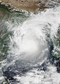 A low pressure area formed in the south Bay of Bengal on 20 October. On 21 October, it organised into a well-marked low pressure area. It strengthened into a depression on 22 October.[55] The same day in the evening, it had consolidated into a deep depression and moving in a west-northwest direction.[56] Over the next 6 hours, it intensified into cyclonic storm and was named Dana by the IMD.[b] On 23 October, it further intesified into a severe cyclonic storm.[58] The system made landfall between 23:30 IST of 24 October and 08:30 IST of 25 October close to Habalikhati Nature Camp (Bhitarkanika) and Dhamra Port on the Odisha Coast, weakening into a cyclonic storm.[59] It weakened into a deep depression at a distance of 40 km north-northwest of Bhadrak[60] and then into a depression about 70 km east-southeast of Keonjhar and remained stationary over that area, weakening further into a remnant low and dissipated on 26 October.[61]