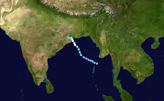 The India Meteorological Department (IMD) to tracked a cyclonic circulation over Myanmar on 11 September.[38][39]This disturbance would coalesce into a low-pressure area the next day,[40] further developing into a well-marked low-pressure just a few hours later.[41] Soon after, it developed into a depression.[42] Early the next morning, it became a deep depression over Bangladesh and West Bengal.[43] On 15 September, it weakened back down to a depression as it slowly moved westward over western India.