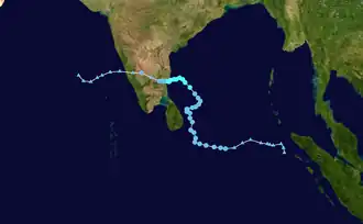 On 14 November, the Bureau of Meteorology noted that a tropical low could form west of Sumatra.[62] Several days later, they noted that the tropical low was developing.[63] Further consolidation due to a westerly wind burst led to the formation of a low-pressure area over Southeast Bay of Bengal and a deadly twin cyclone on 23 November.[64] By 24 November, it intensified into a well-marked low pressure area. It intensified further into a depression on 25 November, moving northwestwards towards Tamil Nadu and Sri Lanka coast. On 26 November, it intensified further into a deep depression, later moving into Sri Lanka. On 29 November, the system strengthened into a cyclonic storm and hence was named Fengal by the IMD.[65] On 30 November, the cyclonic storm made landfall between Karaikal and Mahabalipuram close to Puducherry as a cyclonic storm.[66][67] The next day, on 1 December, the remnants of the cyclone weakened to a deep depression and then further into a depression over the same region.[68] It weakened further into a remnant low over north interior Tamil Nadu on 2 December.[69] Subsequently, the system emerged over coastal Karnataka and proceeded into the Arabian Sea,[70] and dissipated 2 days later.