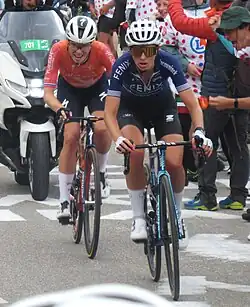 The stage started with a breakaway of 22 riders, including Ghekiere in the polka-dot jersey. On the Col de Tamié, Ghekiere took maximum QoM points, increasing her lead in the mountains classification over Pieterse.[59][60] The lead of the breakaway fell from 2 min 30 s to under 90 seconds as they approached the bottom of the Col du Glandon. The peloton pushed up the climb at a high pace, slowly reducing to a group of GC favourites. With 2.5 kilometres (1.6 mi) of the climb remaining, Vollering attacked from this group – with only Rooijakkers able to follow. Niewiadoma stayed with Lucinda Brand (Lidl–Trek), Évita Muzic (FDJ–Suez) and Gaia Realini (Lidl–Trek), as Vollering and Rooijakkers quickly built up a lead of around a minute by the top of the Glandon. After a 20-kilometre (12 mi) descent into the valley, the pair had a lead of 90 seconds – putting them in the virtual yellow jersey.[59][60] On the flat valley road, Niewiadoma worked with Brand, Realini and Muzic to reduce the gap to the pair ahead. At the foot of Alpe d'Huez, with 13.8 kilometres (8.6 mi) of the stage remaining, the gap had fallen to 45 seconds. On the climb, Vollering and Rooijakkers pushed hard to increase the gap to over a minute – the pair needed a winning margin of around 1 min 10 s to take the yellow jersey. However, Niewiadoma worked with Muzic and Realini to stabilise the gap, with 5 kilometres (3.1 mi) of the climb remaining.[59][60] On the final part of the climb Vollering began to tire, with the gap to Niewiadoma falling to around 50 seconds. In the final metres of the stage, Vollering accelerated past Rooijakkers to take her second stage win of the Tour, taking 10 seconds in time bonuses for winning the stage. Around a minute later, Niewiadoma and Muzic crossed the finish line – with Niewiadoma therefore winning the yellow jersey by a margin of four seconds, the smallest margin of victory in Tour de France history.[59][61]
