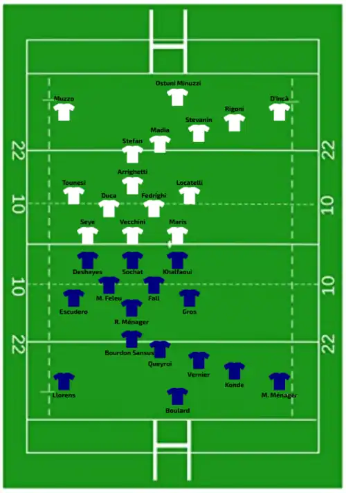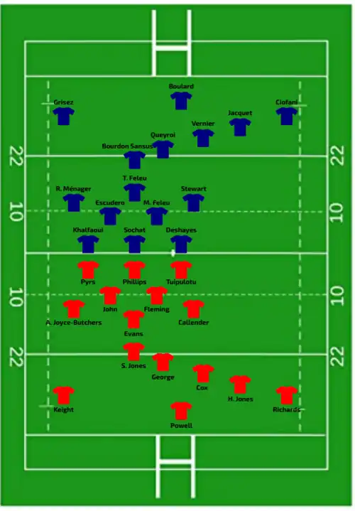 | Try: Martin 35' m | Report | Try: Arbey 53' m Gros 80' +1 c Con: Queyroi (1/2) 80' +2 Pen: Queyroi (1/1) 14' |