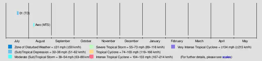 Awo 7 – 8 August Moderate tropical storm 65 km/h (40 mph) 1000 hPa (29.53 inHg) Agaléga None None
