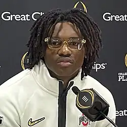 Ohio State began the third quarter with possession of the ball at their own 25-yard line following a touchback by Mitch Jeter. On their second play from scrimmage, Judkins rushed for a 70-yard gain before being tackled at the Notre Dame 5-yard line. After several more plays, Judkins rushed for a 1-yard touchdown, capping a 5-play drive to begin the half and increasing Ohio State's lead to 28–7 following Fielding's successful extra point.[46] Notre Dame appeared to have been held to a three-and-out on their first drive of the second half but ran a fake punt on 4th & 2 which was unsuccessful.[47] This turnover on downs gave Ohio State the ball at the Notre Dame 33-yard line, but the Buckeyes stalled on 3rd & 16 after gaining five yards in five plays and ultimately pushed their lead to 24 points on a 46-yard field goal by Fielding. The Fighting Irish faced 3rd & 19 on the sixth play of their ensuing drive, but a pass interference penalty gave them a first down that extended the possession. Four plays later, they scored for the first time since the opening quarter on a 34-yard touchdown pass from Leonard to Jaden Greathouse which was followed by a two-point pass from Leonard to Jeremiyah Love, narrowing Ohio State's led to sixteen. A pass and two rushes by Howard gained the Buckeyes a first down to begin their next drive; they reached the Notre Dame 45-yard line following a roughing the passer penalty and a 2-yard Henderson rush as the third quarter concluded.[46]