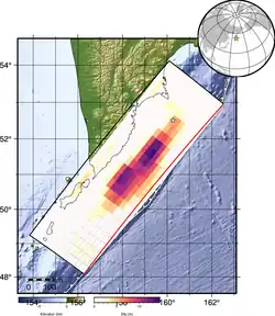A finite fault model released by the USGS indicated slip on an approximately 600 km (370 mi) by 200 km (120 mi) section of the subduction zone and up to a depth of 75 km (47 mi). A majority of the rupture extended 500 km (310 mi) southwest along the subduction zone from the epicenter to the southern tip of Onekotan Island while some slip occurred 100 km (62 mi) northwest heading towards and under Cape Shipunskii. A 400 km (250 mi) by 150 km (93 mi) patch on the fault plane at 10–50 km (6.2–31.1 mi) depth to the southwest of the epicenter exhibited the highest slip. There, at 20–50 km (12–31 mi) depth, at least 5 m (16 ft) of displacement occurred and there were two elliptical areas within where slip exceeded 10 m (33 ft), peaking at 14.5423 m (47.711 ft). At shallower depth near the trench, the slip was limited to 2.5–3 m (8 ft 2 in – 9 ft 10 in).[3] The GEOSCOPE Observatory estimated that the earthquake ruptured the subduction zone for a duration of more than 180 seconds.[24] The USGS estimated the earthquake's duration to be about 240 seconds (four minutes).[3]