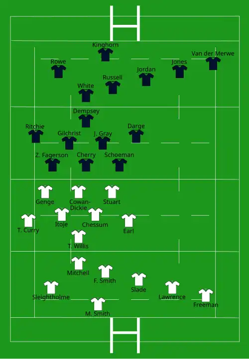 | Try: Darge 3' c Jones (3) 8' c, 60' c, 65' m White 28' m Con: Russell (3/5) 4', 9', 61' | Report | Try: Brex 45' c Con: Allan (1/1) 46' Pen: Allan (4/4) 20', 23', 38', 43' |