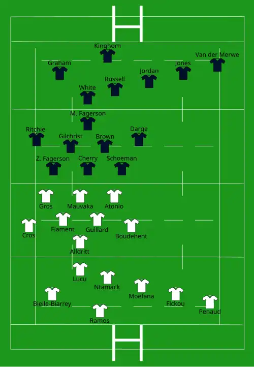 | Try: Attissogbé (2) 18' c, 34' c Bielle-Biarrey (2) 23' c, 40+1' c Marchand 55' m Gailleton 68' m Alldritt 78' m Con: Ramos (4/5) 19', 24', 35', 40+2' | Report |