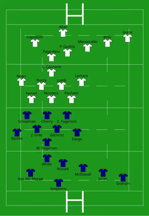 | Try: Capuozzo 20' c Con: Allan (1/1) 21' Pen: Allan (5/7) 7', 29', 34', 61', 74' | Report | Try: Wainwright 69' m Penalty try 79' Pen: B. Thomas (1/1) 17' |