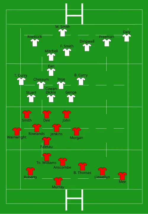 - Dafydd Jenkins and Liam Williams (Wales) were originally named to start the match, but withdrew prior to kick-off due to illness and injury, respectively. They were replaced by Freddie Thomas and Blair Murray, whose places on the bench were taken by Teddy Williams and Josh Hathaway.[28]