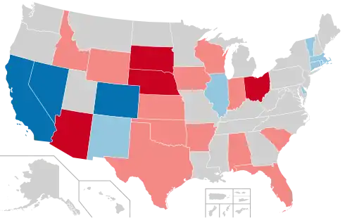 ![]() Democratic incumbent Term-limited Democrat Republican incumbent Term-limited Republican No election | ||||||||||||||||