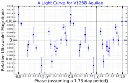 21 Aquilae is a solitary[14] variable star in the equatorial constellation of Aquila. It has the variable star designation V1288 Aql; 21 Aquilae is its Flamsteed designation. This object is visible to the naked eye as a dim, blue-white hued star with a baseline apparent visual magnitude of about 5.1. The star is located at a distance of around 680 light-years (210 parsecs) from Earth, give or take a 20 light-year margin of error. It is moving closer to the Earth with a heliocentric radial velocity of –5 km/s.[6]