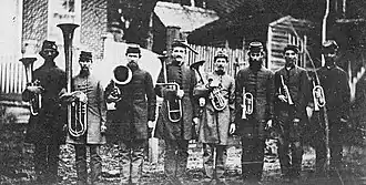 The 26th North Carolina Regimental Band. As it appears, from left to right: S. T. Mickey, A. P. Gibson, J. O. Hall, W. H. Hall, A. L. Hauser, D. T. Crouse, J. A. Leinbach, and James M. Fisher.[2]