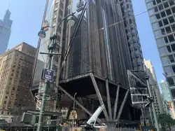 In July 2019, JPMorgan Chase signed an agreement with MTA in which the bank guaranteed that the demolition of 270 Park Avenue would not delay work on East Side Access.[35] That month, scaffolding was wrapped around the tower and podium structure on the Madison Avenue side of the building, the first step in an anticipated 18-month demolition effort.[36] But by late December 2020, only the podium structure had been demolished. Still, parts of the new superstructure were assembled on the Madison Avenue side,[37] and the following month saw the assembly of the new structure's first steel beams.[38] Demolition of the main tower was complete by April 2021; the entire demolition effort wrapped up in June.[39][40]