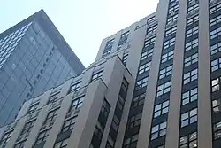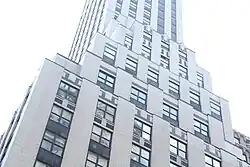 The 40th Street elevation has fourteen vertical bays at the 4th story, with the center six bays being recessed in a light court between four bays on either side. The center bays form a stepped "peak" with setbacks at the 18th through 21st floors.[30] According to architectural writer Robert A. M. Stern, the pyramidal setbacks resembled those on the nearby Chanin Building.[31][4] The four bays to the west and east have setbacks at the 10th and 12th floors. The Madison Avenue elevation has six bays on the 4th through 12th stories, above which is a setback. There are also setbacks at the 14th, 17th, and 20th stories of the northern and western elevations. The eastern elevation rises from the lot line until the 23rd story, where it sets back to the eastern wall of the top twenty stories.[30]
