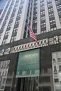 The northern elevation on 40th Street contains eight bays; the main entrance is recessed in the fifth bay from the west.[35] The main entrance has revolving and swinging metal doors, above which is a black metal transom bar with the words "275 Madison Avenue". Atop this bar is a transom window split into four rows of five panes.[35] The panes are separated by vertical mullions, which are flared at the bottom and contain seashell-shaped lighting sconces between them.[26][35] From top to bottom, the rows of openings contain plain windows, sash windows, rectangular metal spandrels, and plain windows.[35] The metal spandrels contain a black representation of a skyscraper with part of a silver "starburst" motif at the top.[26][35] The starburst motifs may represent the Lone Star State, the state nickname of Texas, where Houston Properties was based.[36] To the left and right of the main entrance are metal grilles with full starburst motifs.[26] On the left wall of the entryway is a metal door. Above the entryway and slightly in front of the building's outer wall, there is a translucent glass panel with the metal characters "275".[37]