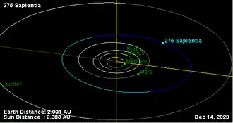 275 Sapientia is a very large Main belt asteroid that was discovered by Johann Palisa on 15 April 1888 in Vienna. It is classified as a C-type asteroid and is probably composed of carbonaceous material. It is named for the Roman personification of wisdom, Sapientia.[3]