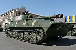 The 2S1 Gvozdika (Russian: 2С1 «Гвоздика», "Carnation") is a Soviet self-propelled howitzer introduced in 1972 and is in service in Russia and other countries as of 2025. It is based on the MT-LBu multi-purpose chassis, mounting a 122 mm 2A18 howitzer. "2S1" is its GRAU designation. An alternative Russian designation is SAU-122, but in the Russian Army it is commonly known as Gvozdika. The 2S1 is fully amphibious with very little preparation, and once afloat is propelled by its tracks. A variety of track widths are available to allow the 2S1 to operate in snow or swamp conditions. It is NBC protected and has infrared night-vision capability.