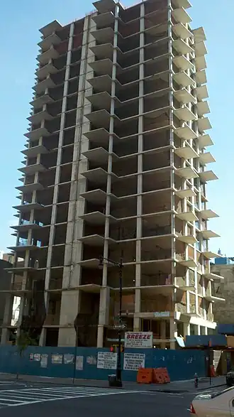 The original design for the skyscraper was a 40-story building that stood 470 feet (140 m) tall.[2] On December 19, 2007, during the building's construction, the developer decided to scale up the building slightly to 44 stories for 117 residential units and 504 ft (154 m) tall. It was only a few months later that the crane collapsed and construction was halted.