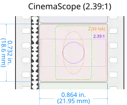 The commonly used anamorphic format uses a similar four-perf frame, but an anamorphic lens is used on the camera and projector to produce a wider image, today with an aspect ratio of about 2.39:1 (more commonly referred to as 2.40:1). The ratio was formerly 2.35:1—and is still often mistakenly referred to as such—until an SMPTE revision of projection standards in 1970.[43] The image, as recorded on the negative and print, is horizontally compressed (squeezed) by a factor of 2.[44]