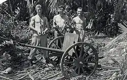 Following this a perimeter was established about 250 yards (230 m) from the beach and the Landing Ship Tank (LST) vessels arrived to begin unloading more stores and equipment. While this occurred, small details of New Zealanders set about the task of rooting out individual Japanese soldiers that had remained hidden during the initial advance inland.[38] Shortly after 7:00 am, the Japanese began to attack the beach with artillery and mortar fire, while a group of Japanese in previously undetected pillboxes began pouring machine-gun fire on to the LSTs, causing a number of casualties amongst the 36th Battalion.[37] By mid-morning the location of the Japanese observation post was discovered and two platoons were sent out by the carrier platoon and 'A' Company. One of these platoons, under Second Lieutenant L. T. G. Booth, subsequently managed to capture two 75 mm guns and a 90 mm mortar after fighting their way up a high point west of the river.[39] Booth was subsequently awarded the Military Cross for his leadership.[40]