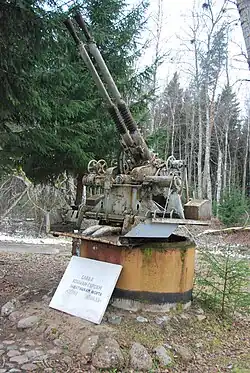 The 37 mm automatic air defense gun M1939 (61-K) (Russian: 37-мм автоматическая зенитная пушка образца 1939 года (61-К)) is a Soviet 37 mm calibre anti-aircraft gun developed during the late 1930s and used during World War II. The land-based version was replaced in Soviet service by the AZP S-60 during the 1950s. Guns of this type were successfully used throughout the Eastern Front against dive bombers and other low- and medium-altitude targets. It also had some usefulness against lightly armoured ground targets.