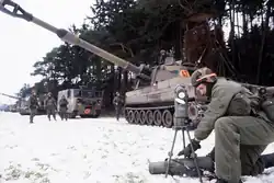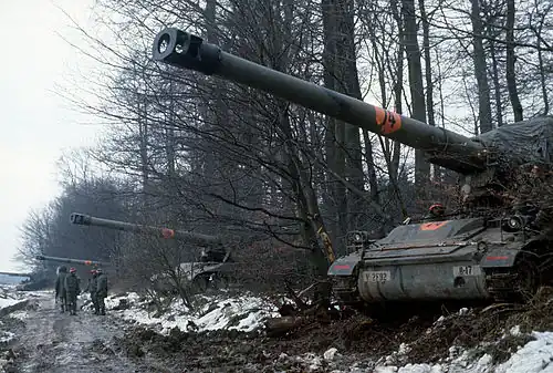 M110A2 203mm self-propelled howitzers of the 1st Battalion, 40th Field Artillery are deployed along a line of trees during Central Guardian, a phase of Exercise REFORGER '85 near Weitershain (Landkreis Gießen).