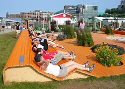During the summer, various activities took place on the site.[35] Quebec historian Bernard Arcand organized 34 lectures on the history of Quebec City.[35] Various artists, including Ima, Marco Calliari, Les Zapartistes, We Are Wolves, Jérôme Minière, Tokyo Police Club, Maurane, and Philippe Lafontaine, performed at the "Grande Place", a temporary outdoor stage erected near Bassin Louise.[35][37] There were also two thousand performances by various street artists and daily children's activities organized by La Boîte à Science, a science centre,[38] and Rêves en Stock, Quebec City theatre.[35] First Nations members also organized cultural activities.[35]