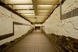 The NYCTA started constructing a 300-foot-long (91 m) passageway between the two stations in 1969. Workers dug a trench measuring 20 feet (6.1 m) wide and 35 feet (11 m) deep, then covered the trench with a 14-foot-deep (4.3 m) layer of fill. The project involved removing 14 plane trees from Bryant Park, which prompted protests from preservationists.[84] The developer of the nearby 1095 Avenue of the Americas office building contributed $500,000 to the station's renovation in exchange for permission to build additional office space.[85] About half of the tunnel was decorated with terrazzo floors; orange brick and tile walls; glass and steel railings; and recessed lighting.[86] The NYCTA completed the tunnel in 1971, upon which it was used by an average of 6,500 passengers during weekdays. The tunnel was decorated with eight porcelain murals, each measuring 10 feet (3.0 m) wide. The murals depicted historical and present-day structures at Bryant Park, including the Latting Observatory and New York Crystal Palace.[87]