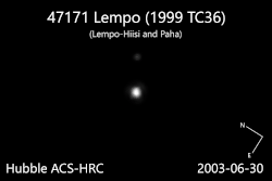 47171 Lempo, or as a binary (47171) Lempo–Hiisi (provisional designation 1999 TC36), is a triple trans-Neptunian object in the Kuiper belt, located in the outermost regions of the Solar System. It was discovered on 1 October 1999, by American astronomers Eric Rubenstein and Louis-Gregory Strolger during an observing run at Kitt Peak National Observatory in Arizona, United States.[2][11] Rubenstein was searching images taken by Strolger as part of their Nearby Galaxies Supernova Search project. It is classified as a plutino with a 2:3 mean-motion resonance with Neptune and is among the brighter TNOs. It reached perihelion in July 2015. This minor planet was named after Lempo from Finnish mythology.[2]