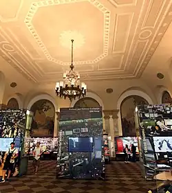The banking room takes up almost the entire 2nd story, and is divided into three sections. These are the north side of the room, taking up much of the space; a raised area on the south, near the balustrade; and a narrow western section behind an arcade. The space has a black-and-white marble floor; plaster walls with marble wainscoting; and an ornamented ceiling with acoustical tiles and large chandeliers.[23] Inside the banking room are eight arched panels that are decorated with murals: five on the north wall and three on the east wall. The north-wall panels depict scenes from the 18th century and the east-wall panels depict scenes from the 19th century.[23][24][d] These murals were painted by James Monroe Hewlett.[27] Also on the east wall of the banking room are screens leading to the elevator lobby. On the southeast corner is a private office, which includes a marble fireplace mantel and wooden decorations.[23]