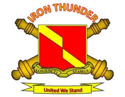 Originally formed as a training unit in 1918 during the waning months of WW I, 4-27 FA served extensively in WW 2 and has taken part in several other conflicts and peacekeeping missions.[3] The unit has achieved two notable battlefield distinctions to date. The first during Operation Desert Storm, when the battalion played a significant role in the 1st Armored Division's defeat of the Iraqi Republican Guard at the Battle of Medina Ridge.[4] The second occurred 12 years later during Operation Iraqi Freedom, when 4-27 FA served in a US Army pilot project to convert artillery units into ad hoc motorized infantry battalions and deploy them in a variety of infantry and military police roles throughout central Baghdad, which earned the battalion the Presidential Unit Citation.[5]