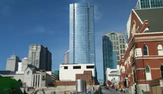 505, previously known as 505 CST and Paramount, is a residential skyscraper in downtown Nashville, Tennessee, located at the intersection of Fifth Avenue and Church Street. 505 stands on the location originally intended for the cancelled Signature Tower.[3] The 45-story building is 543 feet (166 m) tall[2] and feature 403,000 sq ft (37,400 m2) of floor space.[4] 505 is the tallest building in Nashville based on occupied floors,[6] and the third tallest overall behind the AT&T Building and the Four Seasons Hotel and Residences.[3] It includes 500 apartment units ranging from under 400 sq ft (37 m2) to more than 4,000 sq ft (370 m2),[6] with an option to later convert the top 175 units to condominiums.[4] Other planned areas include three retail spaces including an 8,000 sq ft (740 m2) ground-level restaurant,[6] a 45,000 sq ft (4,200 m2) amenity level,[4] and 690 parking spaces.[3] It is expected to cost US$169 million.[7] The architect is Solomon Cordwell Buenz.[3]
