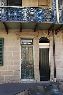 One of a pair of mid Victorian face sandstone terraces with top balconies cantilevered over the footpaths. This residence has three bedrooms. Storeys: Two; Construction: Face stone walls, slate roof to main body of roof, corrugated galvanised iron roof to balcony. Cast iron wall brackets, balcony posts, iron lace balustrade. Style: Victorian Georgian.[1]