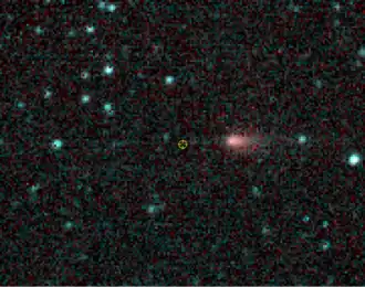 57P/du ToitNeujminDelporte is the designation of a periodic comet. It is a member of the Jupiter family of comets whose orbits and evolution are strongly influenced by the giant planet.[5] In 2002 it was discovered to have broken up into at least 20 fragments.[6] At the time of their discovery, these shed fragments were spread out along the orbital path subtending an angle of 27 arcminutes from the comet's surviving head.[7]