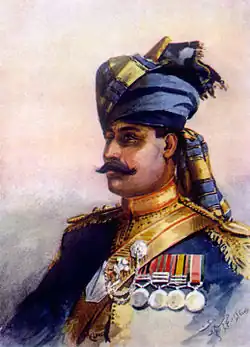 The regiment known as 11th King Edward's Own Lancers (Probyn's Horse) was originally raised on 1 August 1857 by Captain Frederick Wale as Wale's Horse during the Indian Rebellion of 1857 and served at Lucknow. Captain Wale was killed in action on 1 March 1858, while leading the regiment in the pursuit of rebels, and was replaced by Major Dighton Probyn, VC. In 1860 the regiment was dispatched to China to take part in the Second Opium War. It participated in the advance on Peking and returned to India in 1861 with a good reputation. The regiment saw service in the Second Afghan War of 1878-80 and then took part in the Black Mountain Expedition; it went to Chitral and formed part of the Malakand Field Force. During the First World War, the regiment served in Mesopotamia.[1][2]