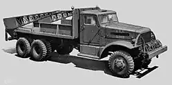 Built on a long, reinforced chassis, they were used to carry treadway pontoon bridges for Engineer Combat Battalions.[13] A large double arm hydraulic boom built by Heil was used to self unload components, often directly into a river. A 25,000 lb (11,000 kg) winch was mounted at the front. They had an auxiliary air compressor and large reservoir tanks, used to inflate pontoon floats. Brockway built 1,166, White 1,152, Ward LaFrance 589, and FWD 168.[6][14][15][16]