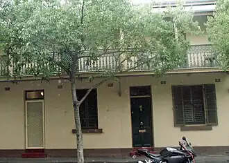 A simple well proportioned two-storey Victorian terrace house with two bedrooms. Features include a cantilevered balcony over footpath, a corrugated iron verandah painted in wide stripes, french doors with fanlight on upper storey, panelled front door with fanlight and single window with slab sill and shutters on ground floor. Storeys: Two; Construction: Painted rendered masonry, corrugated galvanised iron roof. Timber framed balcony with decorative iron lace balcony. Painted timber joinery. Style: Victorian Filigree.[1]