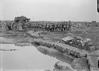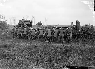The ASC company was absorbed into the brigade's ammunition column on 25 April.[9] The battery was reassigned to VII Corps Heavy Artillery on 11 May.[10] When 96th Siege Bty arrived from the UK it took over 62nd Siege Bty's 9.2-inch howitzers in their emplacements on 25 May.[10][13] The battery's personnel then joined X Corps with Fourth Army on 8 June[10]