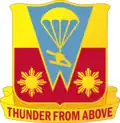 - Description: A Gold color metal and enamel device 1 1/8 inches (2.86 cm) in height overall consisting of a shield blazoned: Per fess enhanced Or and Gules, on a pile of two points Azure (Korean service ribbon Blue) fimbriated at the first between in base two Philippine suns of the like, a howitzer mounted on a heavy drop platform and attached to an open parachute all of the last. Attached below the shield a Gold scroll inscribed “THUNDER FROM ABOVE” in Red letters.