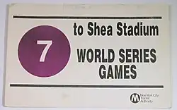 The 7 was the last route to run using "Redbird" cars, and the 7's fleet consisted entirely of R33S/R36 Redbird trains until February 2002. In 2001, with the arrival of the R142/R142A cars, the Transit Authority announced the retirement of all Redbird cars. From January 2002 to November 2003, Bombardier-built R62A cars from other routes gradually replaced all of the Redbird cars on the 7. The first R62As entered service on the 7 route on February 19, 2002.[78] On November 3, 2003, the last Redbird train made its final trip on this route, making all stops between Times Square and the then-named Willets Point–Shea Stadium.[79] Several Redbird cars running on this service were decorated with Mets logos and colors during the 2000 World Series against the New York Yankees, as the Flushing Line runs adjacent to Citi Field and the former location of Shea Stadium.[80]