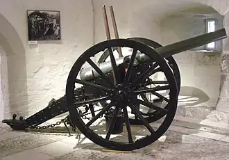 The gun was mounted on an iron carriage with a steel axle, and wooden wheels with iron tires. There were two brackets of sheet iron which converged to the point where the gun was towed. The gun was fixed with its trunnions fitting into two semi-circular openings in the brackets. These were then locked shut with a semi-circular iron clasp. Between the brackets there was a small trail-box. The elevation screw came up from the carriage to a point below the breech of the gun. The screw was operated by a hand-wheel situated on the outer face of the right bracket.[8] The gun carriage did not allow for sideways movement of the barrel. Taking aim was done by shifting the rear of the carriage. To gain leverage, one of the poles sticking upwards on the side of the barrel (see e.g. the photo of the gun in the Waadtländisches Militärmuseum Morges) was placed in an opening at the end of the carriage.