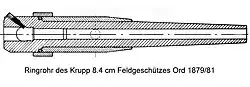The 8.4 cm Feldgeschütz Ord 1879 (later: Ord 1881/93) weighed 1,100 kg ready to fire. The Krupp barrel was a built-up gun. The inner tube had a breech, and was coiled with two other layers. In total, the barrel and breech weighed 425 kg.[1] The outer length of the barrel was 25.6 caliber, or 2150 mm.[1] On the inside the length till the breech was 1930 mm. The barrel had 24 grooves, increasing from 0 to 4 degrees. The breech was closed with a Broadwell Ring. This ring was pressed forward on closure, and then pressed back by the explosion, preventing the escape of poisonous gasses.