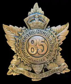 The 85th Battalion was raised in Halifax on 14 September 1915 and it recruited throughout Nova Scotia.[1][2] The battalion embarked for Great Britain on 12 October 1916, and landed in France on 10 February 1917.