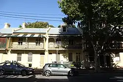 An interesting three-storey early Victorian house with cantilevered balcony over the footpath and cast iron balustrade and timber columns. Between No. 92 and No. 90 there is a passageway to the rear. This residence has five bedrooms. Storeys: Two; Construction: Painted rendered masonry, corrugated galvanised iron roof, timber verandah, cast iron columns. Style: Victorian.[1]