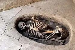 After more than 400 rooms had been excavated, the total number of individual found to have been buried within the settlement did not surpass 70. All these burials were under building floors. The dead were placed in pits cut through the floor during the occupation of the building. The buried are people of both sexes and all ages. There is a variety of skeletal body postures, from burials in a hocker (fetal) position to extended skeletons facing upwards. Others are lying on one side, occasionally with the legs bent at the knees.[2] The orientation of the burials varies within the buildings, as does the number of individuals buried inside them.[5]