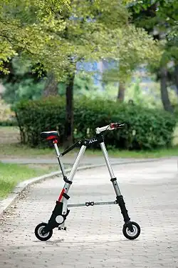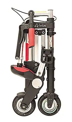 The A-bike is a folding bicycle released by Sir Clive Sinclair in the United Kingdom on 12 July 2006. It was designed by Hong Kong design agency Daka, in collaboration with Sinclair Research, over a 5-year period. It was announced to the public in 2004. Clive Sinclair envisioned the A-bike, and Alex Kalogroulis was the main designer. It weighs 5.7 kg (13 lb) and folds to 67×30×16 cm (26.4×11.8×6.3 in), small enough to fit in a rucksack. The first version had 15 cm (6 in) wheels, which was increased to 20 cm (8 in) in later models. In 2015, an electric version, the A-Bike Electric, was introduced to the public as part of a Kickstarter campaign.